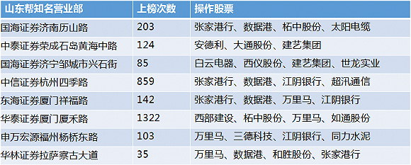 据不完全统计,市场上号称山东帮的席位超过200家,界面新闻通过龙虎榜数据统计、搜索引擎舆情分析以及相关个股技术走势分析,筛选出一些山东帮席位。