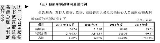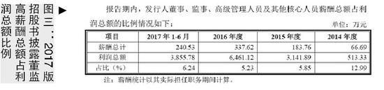 2016版招股书显示,2015年度董监高薪酬总计为215.85万元,占当年总利润的6.87%(如图二),而2017版招股书则显示,2015年度董监高薪酬为183.76万元,占当年总利润的5.85%(如图三)。