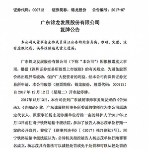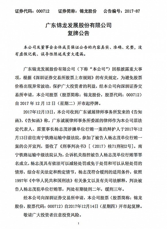 12月13日晚间,锦龙股份发布公告称,南宁铁路运输中级法院当日判决,公司原法定代表人、原董事长杨志茂单位行贿罪罪名成立,判处有期徒刑二年,缓刑三年,同时公司将于12月14日开市起复牌。