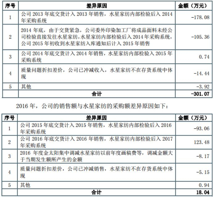 目前,金太阳已经在最新更新的招股书中对自身和水星家纺的交易对账进行了详细的披露,并且解释了出现差异的具体原因,认为存在的差异合理。