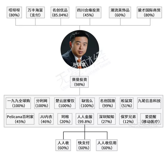 叶国富的财富其实远不仅此,他还有另一个低调的身份——赛曼控股集团董事长。他被称为“互联网金融教父”,投资并整合人人收、缺钱么、分利宝,一手搭建理财、消费、催收业务的互金“铁三角”,并将生意版图悄悄扩张至零售、家居、跨境商品,甚至炸鸡——因韩剧《来自星星的你》而火爆一时的餐饮网红店,背后也有他一杯羹。