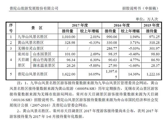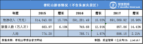 原文这么写:“2017 年度,普陀山景区(不含朱家尖景区)接待游客 857.86 万人次,较上年增长 14.43%,朱家尖景区接待游客 764.14 万人次,较上年增长 17.93%,普陀山风景名胜区合计接待游客人数合计达 1,622 万人次,较上年增长 16.05%。”