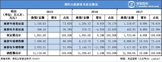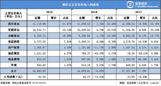 像普陀山这样的景区,游客量的增减和客运收入的增减是直接相关的,其他消费(如索道、餐饮、商品销售等)或许不同的人群会有不同的消费选择,但客运、水运是普陀山景区的“基础性消费”、是“刚需”。从主营业务收入构成表上可以看到,2016年客车客运和水路客运的增长都仅有百分之一点几,2017年增长在9%~10%,陆运水运增长量较为一致,但却与游客增长量完全偏离。