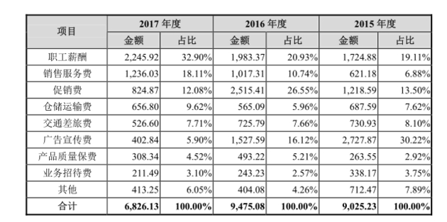 《每日经济新闻》记者发现,报告期内,铁将军广告宣传费变动幅度较大,2015年曾达到2727.87万元,占销售费用比例超过30%,但随后逐步降低,至2017年降为402.84万元,占比低至5.90%。