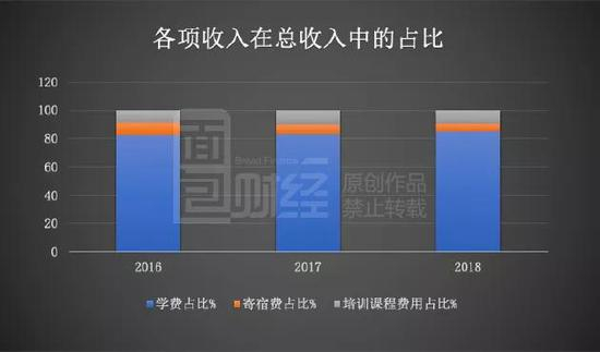数据显示,学费收入在近三年呈增长态势,在收入中的占比也在不断提升。其余两项寄宿费和培训课程费用在总收入中的占比较小,其中寄宿费的占比在不断下降,而培训课程费用基本保持稳定。