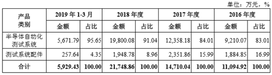 从产品类型来看,华峰测控的收入来自半导体自动化测试系统的比重连续增长,报告期内分别为83.01%、84.01%、91.04%、95.65%,而剩余测试系统配件的占比则连续下降,即产品销售更倾向于系统而非配件。