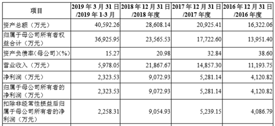 2016年至2018年以及2019年第一季度(下称“报告期”),华峰测控的营业收入分别为1.12亿元、1.49亿元、2.19亿元、5978.05万元,归母净利润分别为4120.82万元、5281.14万元、9072.93万元、2323.53万元。业绩逐年提升。
