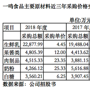 报告期内,白砂糖的采购单价分别为6.34元/千克、7.15元/千克以及6.25元/千克,而果酱类原材料采购单价分别为11.03元/千克、13.46元/千克以及12.00元/千克,在2017年,原材料价格普遍上涨。而一鸣食品倚重单一品牌和主力产品的特点,加剧了对于原材料市场价格变动的敏感程度。