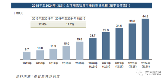 根据弗若斯特沙利文报告,中国潮玩零售的市场规模由2015年的63亿元增加至2019年的207亿元,复合年增长率为34.6%。同时,受中国潮玩的受欢迎程度不断上升所推动,这一市场规模预期将于2024年达到763亿元。