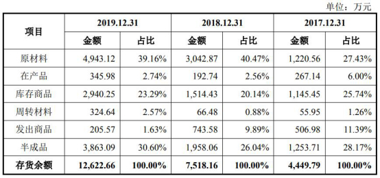 2017年至2019年,公司应收账款余额分别为8559.81万元、1.52亿元和2.18亿元,占营业收入比例分别为24.06%、34.55%和39.92%。公司存货余额分别为4449.79万元、7518.16万元和1.26亿元,增长十分迅速。