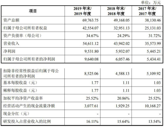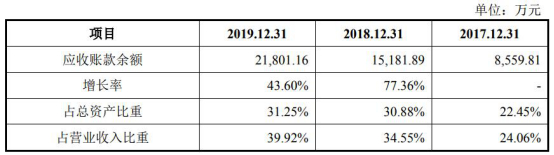 2017年至2019年,公司应收账款余额分别为8559.81万元、15,181.89万元和21,801.16万元,占资产总额的比例分别为22.45%、30.88%和31.25%,占营业收入比例分别为24.06%、34.55%和39.92%。