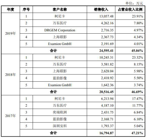 值得关注的是,奕瑞科技董事、实控人之一的杨伟振曾于2000年至2011年在蓝韵实业任研发工程师、研发总监,而与蓝韵实业受同一实际控制人控制的蓝韵影像,在2017年、2018年是奕瑞科技的第四大客户。