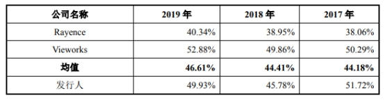 同期行业可比公司的毛利率均值为44.18%、44.41%和46.61%。
