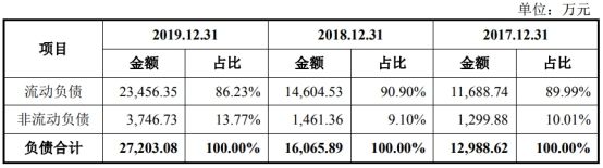 奕瑞科技的负债也持续攀升,2017年至2019年负债总额分别为1.30亿元、1.61亿元和2.72亿元。其中主要由流动负债构成,分别是1.19亿元、1.46亿元和2.35亿元。
