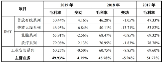 2017年至2019年,奕瑞科技的主营业务毛利率分别为51.72%、45.78%和49.93%,招股书披露,主要系受客户结构、产品成本结构、太仓生产基地新投产及中美贸易摩擦等因素的影响,毛利率出现一定程度的波动。