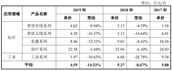 目前奕瑞科技的主要产品数字化X线探测器产品均价呈下降趋势,2017年至2019年平均售价分别为5.88万元/台、5.37万元/台和4.59万元/台。
