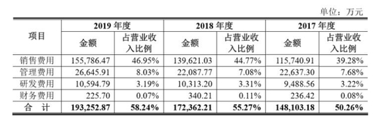 其中销售费用是所有费用中占比最高的一项,报告期内分别为11.57亿元、13.96亿元和15.58亿元,占营业收入的比例分别为39.28%、44.77%、46.95%。