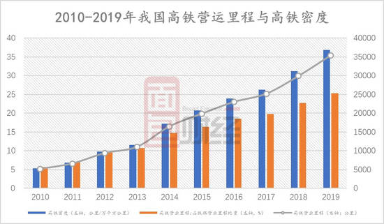 图2:2010-2019年我国高铁运营里程与高铁密度