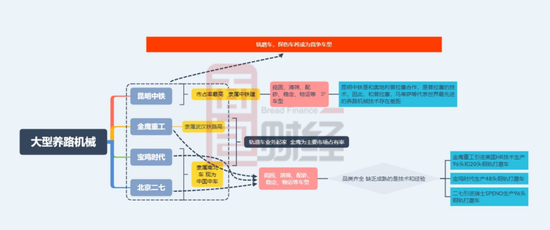 目前国内生产大型养路机械的主要有昆明中铁、金鹰重工、北京二七和宝鸡时代。国内市场占有率昆明中铁最高,其隶属于中铁建,主要是捣固、清筛、配砟、稳定、物运等车型;金鹰重工和宝鸡时代是做轨道车起家,金鹰重工市场占有率较高,其隶属于武汉铁路局;宝鸡时代和北京二七分隶属南北车(2014年合并为中国中车)。