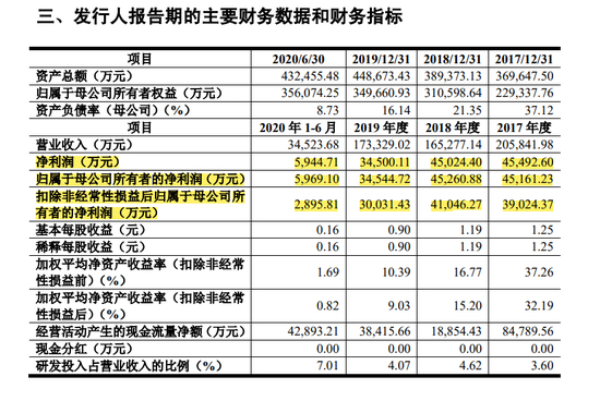 发行人 2020 年 1-6 月营业收入、归母净利润、扣非后归母净利润分别为 34,523.68万元、5,969.10 万元、2,895.81 万元,同比分别减少 23.55%、增长 8.96%、增长 23.16%。2020年1-6月的综合毛利率为25.12%,相较于2017年、2018年、2019年分别为36.86%、45.26%、36.83%的综合毛利率降幅较大。