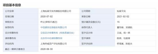 2021年2月2日,本所审核认为上海灿星文化传媒股份有限公司不符合发行条件、上市条件和信息披露要求。根据《深圳证券交易所创业板股票发行上市审核规则》第六十七条,本所决定终止对其首次公开发行股票并在创业板上市的审核。