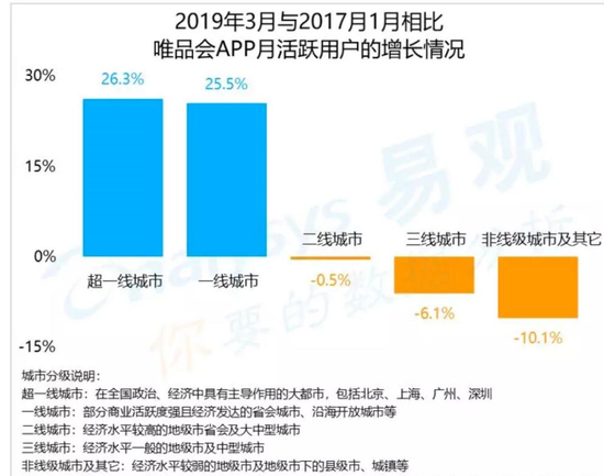 在分析报告中,陈涛指出2017、18两年以来,唯品会的月活跃用户在高线城市有所增长,但在低线城市不但没有增长,还有所降低,而且越到下沉的市场,下降幅度越大。“没有注意到、没有抓住下沉市场的崛起,也许是唯品会陷入用户增长停滞怪圈的一大重要原因。”