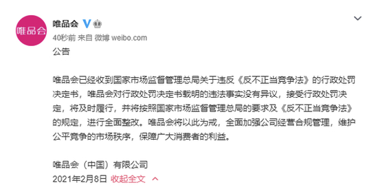 2021年1月14日,唯品会通过官微表示,接到国家市场监管总局通知,对唯品会涉嫌不正当竞争行为立案调查。唯品会表示积极配合监管部门调查。2月8日,市场监管总局对唯品会不正当竞争行为作出行政处罚罚款300万,唯品会方表示接受行政处罚决定,将进行全面整改。