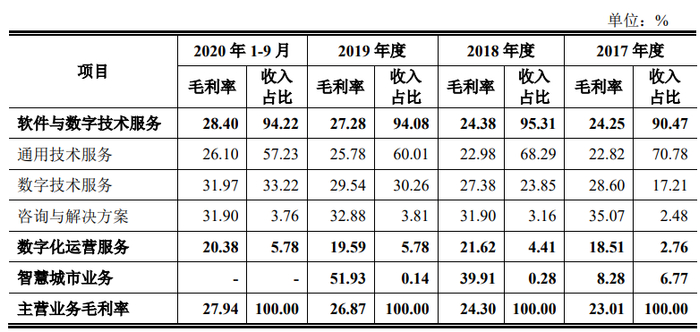 过去几年,数字技术服务和咨询解决方案的收入占比有所提升,从2017年合计占比19.69%增长到2020年前三季度合计占比36.98%。