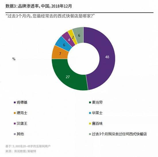 小食代拿到的一份英敏特在2019年发布的报告显示,基于对3000名20-49岁的互联网用户的调查,品牌渗透率最高的西式快餐店依次是肯德基、麦当劳、德克士、华莱士、汉堡王和赛百味。