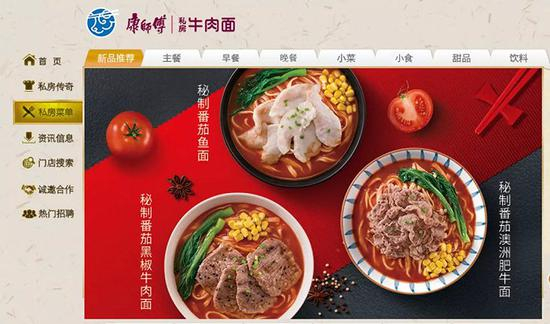 事实上,这家名叫“康师傅私房牛肉面”的餐馆并不只是卖牛肉面。小食代翻阅的官网资料显示,其还出售肥牛饭、鸡丝卷饼、麻辣香锅、凉拌海藻、鸡翅、手抓饼、卤味、酸奶布丁、奶茶、果汁、啤酒等多种菜肴、佐餐小食、甜品和饮品。但主打菜式,仍然是各种不同风味的牛肉面。