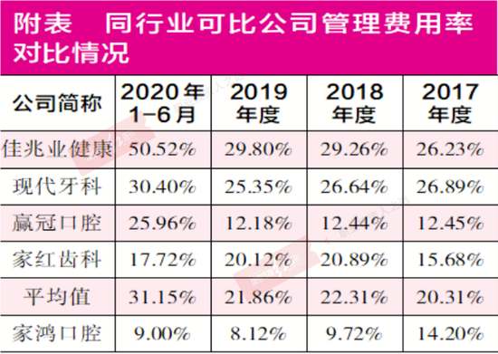 更值得关注的是,家鸿口腔的管理费用率异常低。据招股书显示,报告期内,其可比公司管理费用率的平均值分别为20.31%、22.31%、21.86%、31.15%,家鸿口腔的管理费用率分别为14.20%、9.72%、8.12%、9.00%,远低于行业均值。而同行业中除了赢冠科技和家红齿科的管理费用率在部分年份低于20%的水平外,其他企业在报告期内均在20%以上(详见附表),这表明该水平才为行业常态,但家鸿口腔的管理费用率大多数年份均不足10%,低得有些出奇。