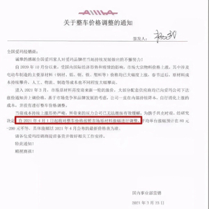 近期,网络上流传出2021年3月23日爱玛科技致全国爱玛经销商《关于整车价格调整的通知》消息。该“通知”显示,当前成本持续上涨形势严峻,所带来的压力公司已无法继续有效缓解,为携手共克时艰,经研究决定,自2021年4月1日起将整车价格按照市场原材料涨幅进行调整,平均单台涨幅预计在80元-200元不等,具体涨幅以2021年4月公布的最新价格表为准。