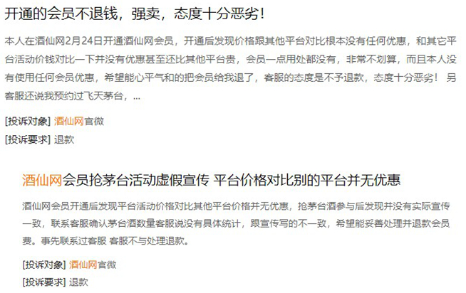 《每日财报》在查询黑猫投诉时发现,在该平台上对酒仙网的投诉量已经超过了600条,其中不少网友均表示开通酒仙网的club“会员价格相较于其他平台并无优惠”、“开会员后原价抢茅台无法点开抢购页面”、“在要求退会员费时客服不予处理退款”等情况,甚至直言酒仙网存在以极少的茅台为噱头诱导消费者缴纳会费的情况。。