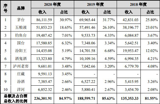 在2020年销售收入前十大的白酒名牌中,于报告期内贡献收入的前三名为茅台、五粮液和钓鱼台,占比分别是30.97%、18.65%和7.01%。由此可见,茅台和五粮液的占比几乎形成了白酒销售总额的半壁江山。