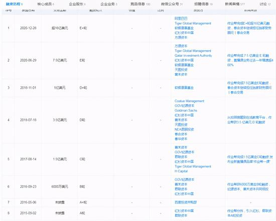 除此之外,作业帮投资方中还有软银愿景资金、天图资本、老虎全球管理基金、卡塔尔资本、阿里巴巴等数十家机构。根据公开消息,作业帮在2020年12月28日拿到了最后一笔16亿美元的融资,最新估值大约110亿美元,这一估值在美国上市的在线教育中概股的市值中也能排在头部。