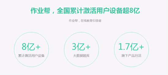 作业帮官网的数据显示,目前作业帮全国累计激活用户设备超过8亿,产品月活达到了1.7亿。根据第三方机构的分析,作业帮是K12在线教育赛道的用户规模领先者,易观天下的数据显示,猿辅导截至2020年12月的月活367.3万,而同期的作业帮已经突破了1亿。