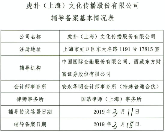 时间来到2019年3月,虎扑重整旗鼓计划再次冲击A股上市,并选择了中金公司、东方财富证券联合签订上市辅导协议,两家保荐机构共委派17人组成虎扑IPO项目辅导工作小组。