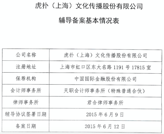 事情回到2015年6月12日,虎扑在中金公司的保驾护航下完成了上市辅导备案。此后,在长达8个月的辅导期内,经过尽职调查、集中授课、分析讨论、规范和健全制度等多个环节,中金公司最终在2016年2月宣布虎扑“已具备了向中国证监会报送首次公开发行股票申请的条件”。
