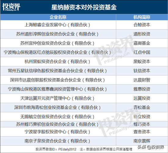 值得注意的是,星纳赫资本还是多家知名基金背后的“金主”。天眼查App显示,这几年间,星纳赫资本对外投资了包括达晨财智、青松基金、黑蚁资本、钛信资本、红点中国、嘉御基金、道彤投资等近15家投资机构。
