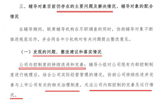 辅导工作进展报告也给出了整改建议。辅导小组对公司现有内控制度进行梳理后,结合公司实际经营管理的情况,协助公司持续改进并完善与上市公司有关的相关治理制度,关注公司内部控制的完善及运行情况。(北京时间财经 袁应泉)