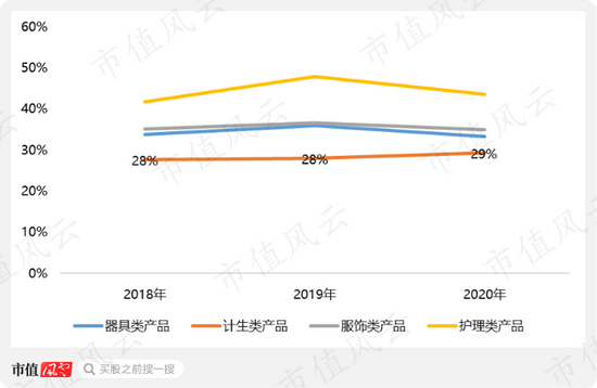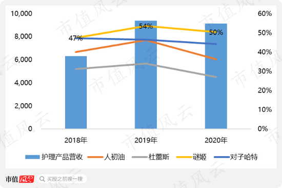 谜姬还是护理类产品中毛利率最高的产品,自有品牌拥有享有品牌溢价的权利,但另一个不容忽略的事实就是护理类产品2020年营收下滑2.59%。