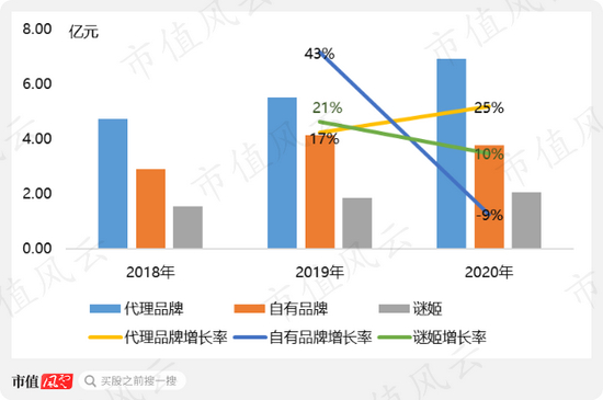 如果区分自有和代理品牌对收入增长贡献的话,自有品牌是2019年增长的主要驱动力,而代理品牌是2020年营收增长的主要驱动力,自有品牌增长缺乏持续性。