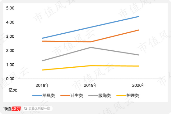 同时也因为进入门槛更低,2020年市场竞争加剧叠加天猫平台对服饰类产品限制使用组合、赠品等销售方式,2020年服饰类产品营收下滑25.44%。