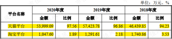 2018至2020年,天猫(含淘宝)平台分别贡献了醉清风线上零售业务的97.76%、99.04%和99.45%,贡献比逐年上升,且越来越接近100%。