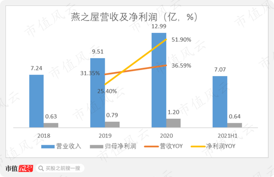 2018年以来,燕之屋的业绩始终保持增长。2020年,燕之屋实现营收12.99亿,同比上升51.9%,实现归母净利润1.2亿。2021年上半年,公司实现营收7.07亿,净利润0.64亿元。