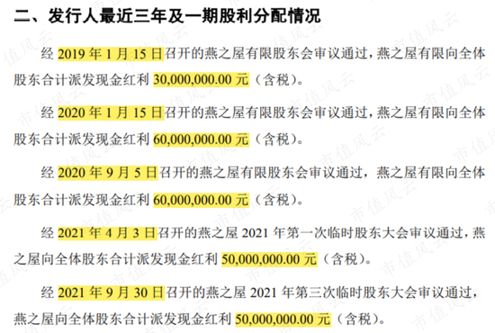 根据招股书,2019年至2021年,燕之屋共分红5次,累计分红2.5亿。