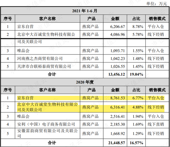 其中,公司收购的北京地区经销商中,北京中大百诚堂生物科技有限公司(简称“中大百诚堂”),2019年至2021年上半年,均是燕之屋的第二大客户,2018年是公司的第一大客户。2021年3月,中大百诚堂相关业务已经剥离。