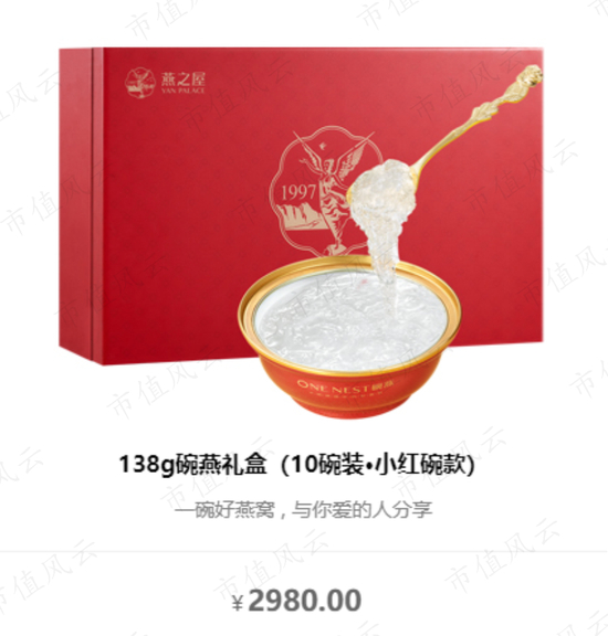 以燕之屋的明星产品碗燕为例,风云君经燕之屋官网查询,小红碗碗燕(138g*10碗)售价为2,980元,相当于一碗138g的碗燕要298元。