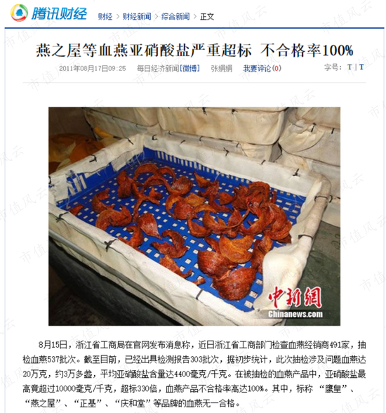 虽然,近几年,随着广告铺天盖地的投放,燕之屋似乎声名鹊起。但是,早在2011年,公司因销售的血燕亚硝酸盐严重超标,而被3·15栏目以及《焦点访谈》点名。