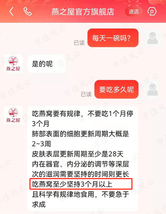 按照客服的建议,燕窝要每天吃一碗,连续吃3个月才会有效果。如果是298元1碗的小红碗碗燕,3个月坚持下来则要2.68万元。